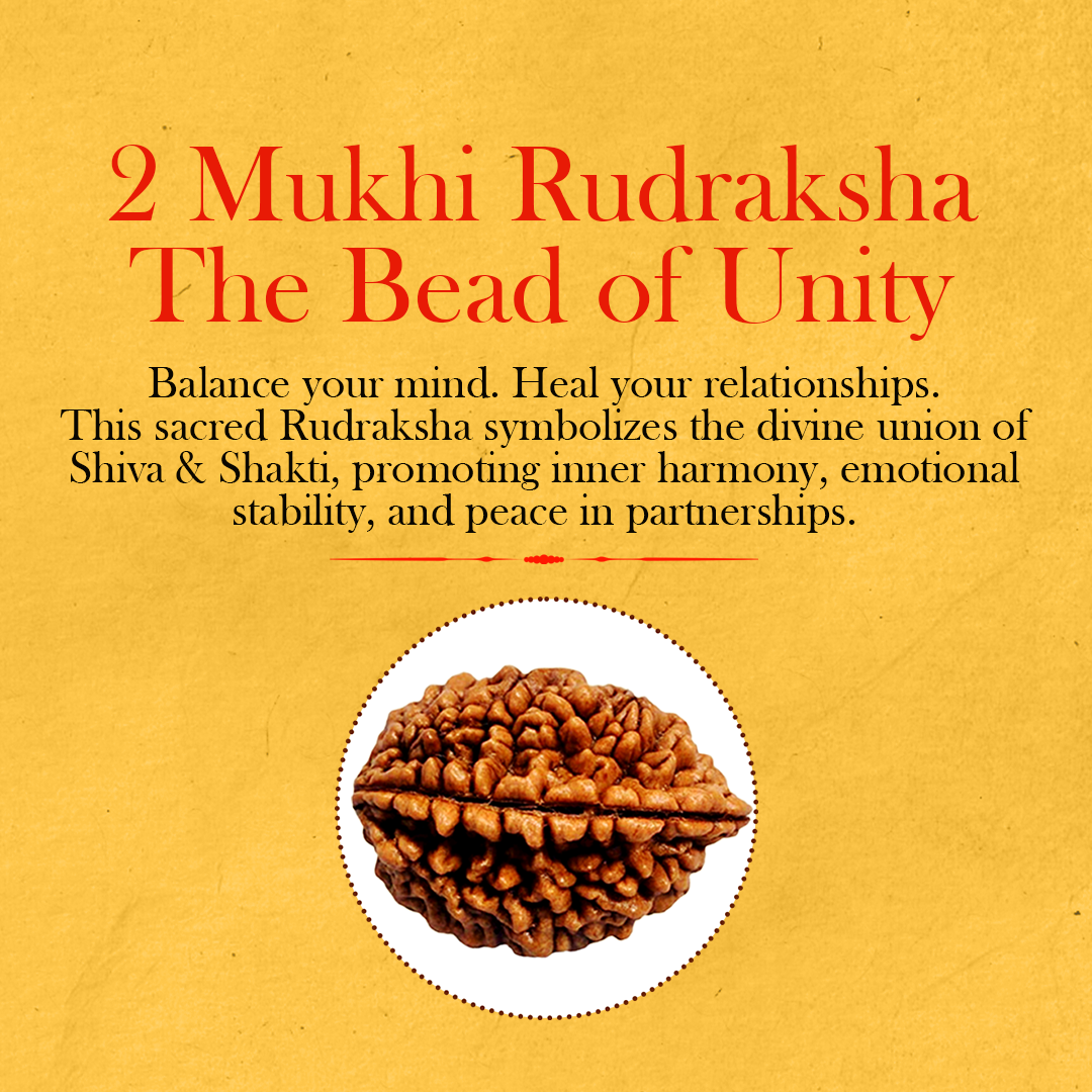 Rudraksha originated from the tears of Lord Shiva. 2 Mukhi Rudraksha is specially blessed by Ardhanarishvara, the combined form of Shiva and Parvati, symbolizing the perfect union of male and female energies. This duality is reflected in the two Mukhi (faces) of the Rudraksha, which represent harmony and balance.