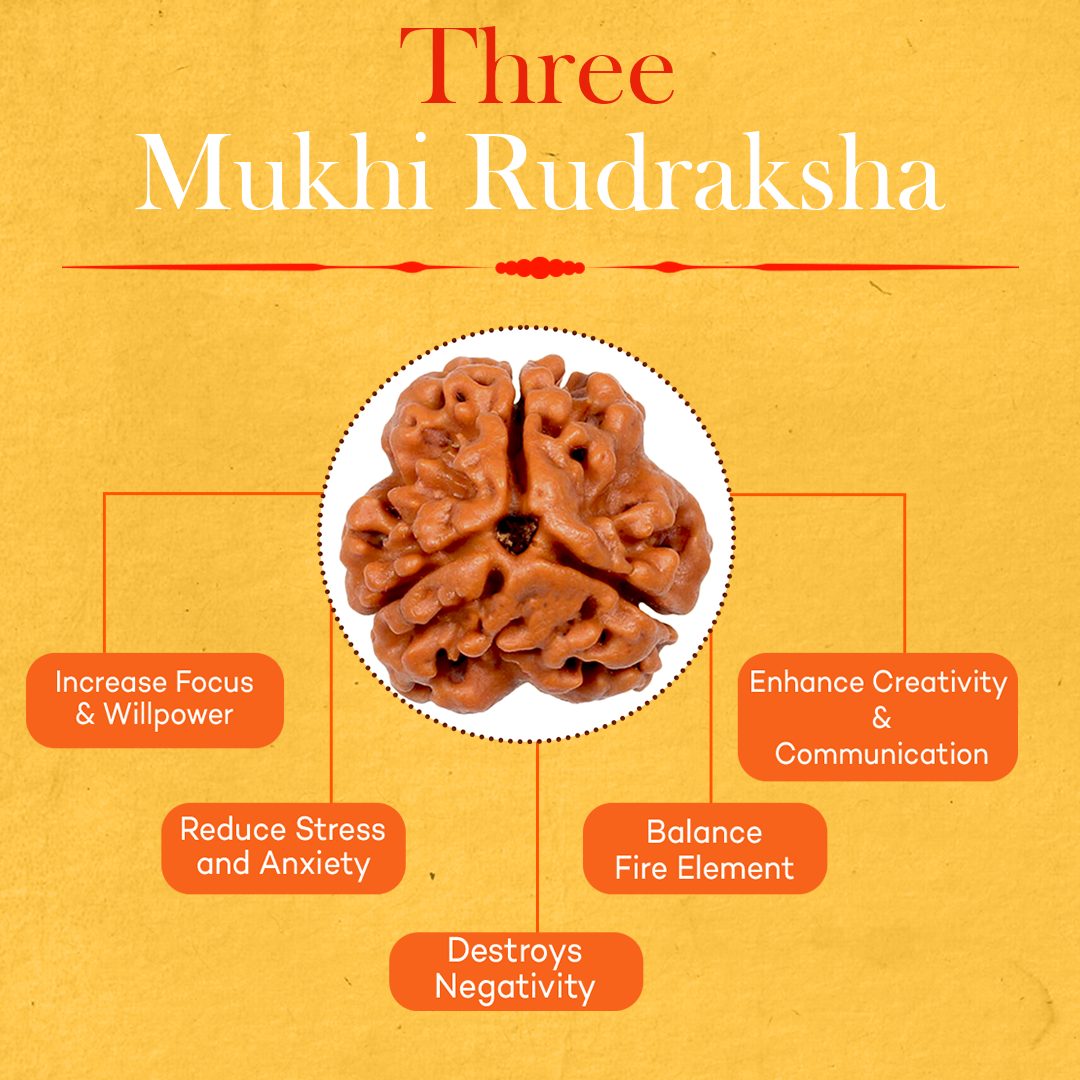 The three-faced Rudraksha is the fruit-giving benefic of all means and all knowledge is established by its influence. The three-faced Rudraksha is the form of fire, which destroys the sins of three births